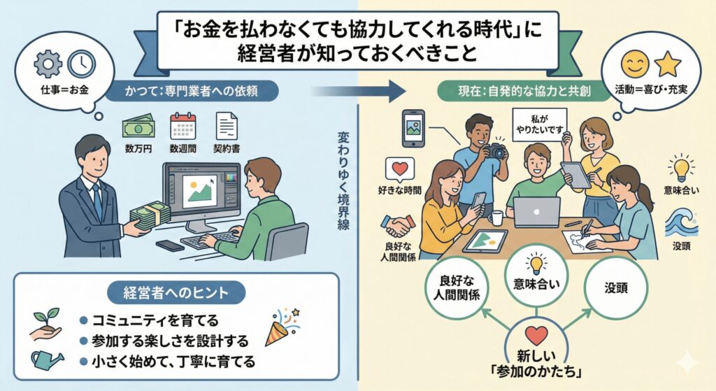 技術の進歩と価値観の変化が重なり、「無償でも協力したい」と思える環境があれば、人は自ら参加してくれる時代になりました。