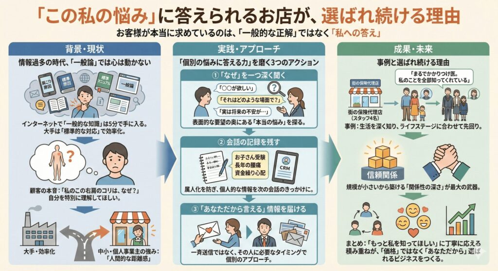 今回は、この「個別の悩みに答える力」が、なぜお客様との長期的な関係につながるのかを、具体的な事例とともに考えていきます。