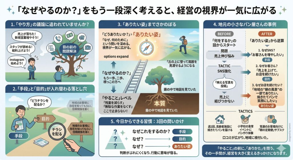 大切なことは、「なぜ(何のために)それをするのか?」について、「どうありたいか」までさかのぼって考えることです。