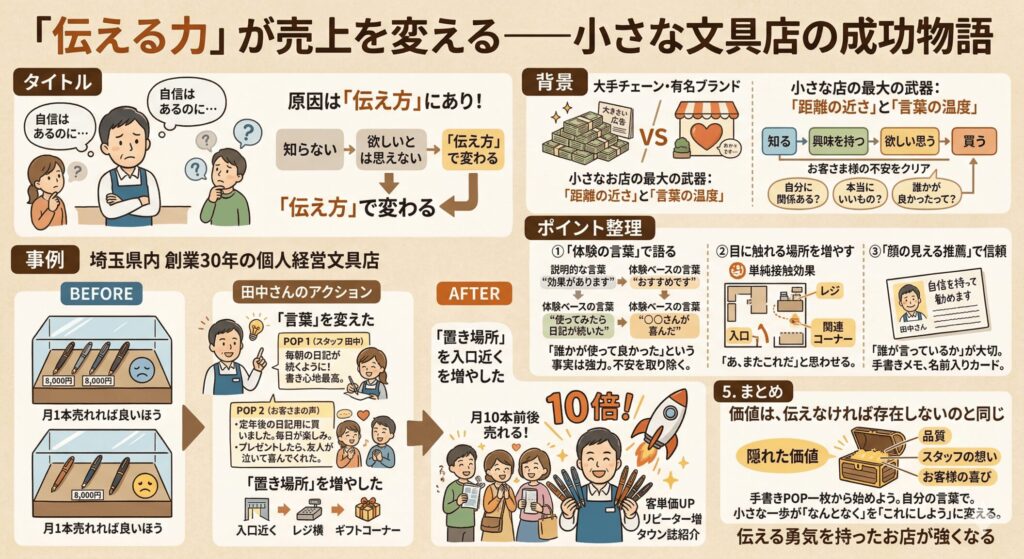 今回は、ある個人経営の文具店が「伝え方」を変えただけで、ある商品の売上を劇的に伸ばした実例をもとに、中小企業・個人事業の経営者の方が今日から使える「価値の伝え方」のヒントをお届けします。