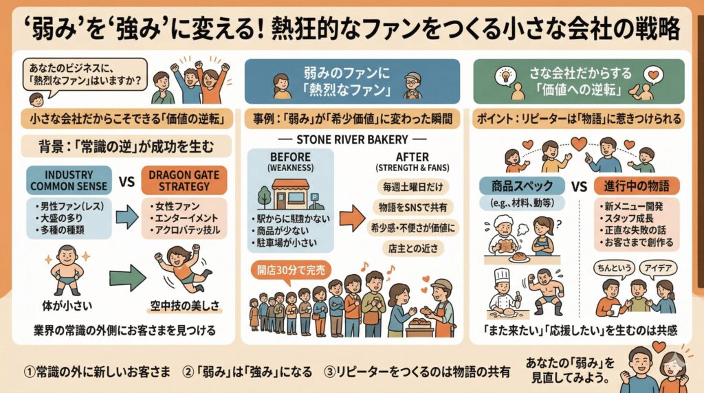 今回ご紹介するのは、プロレス団体「ドラゴンゲート」の戦略から読み解く、小さな会社だからこそできる「価値の逆転」と「熱烈なリピーターのつくり方」というお話です。