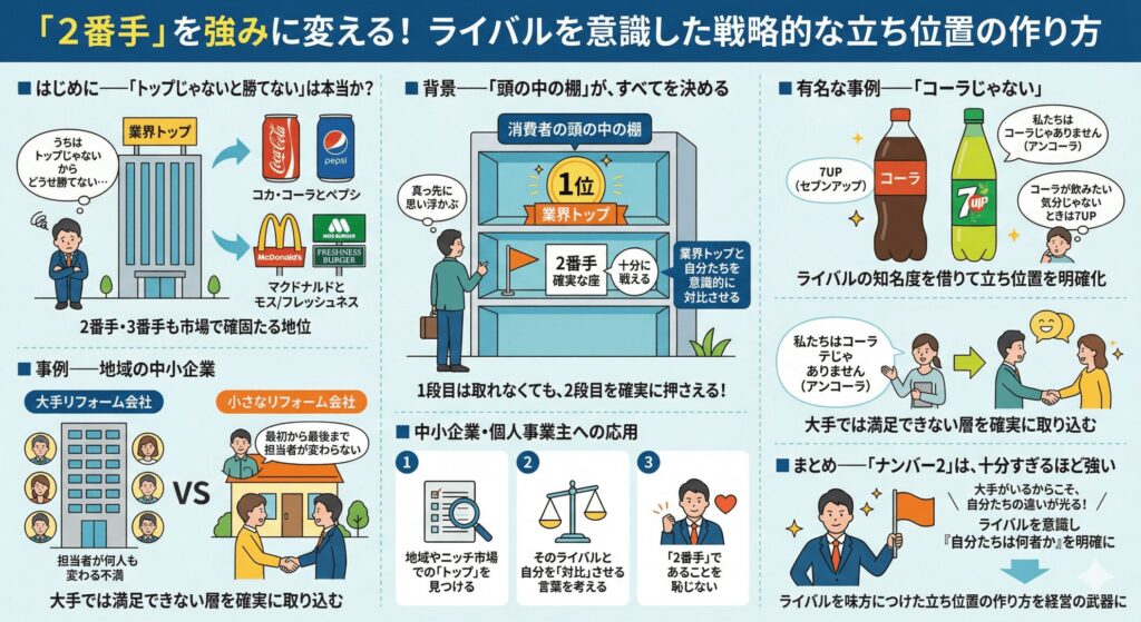 そして、2段目の座を確実にするためにもっとも有効な方法のひとつが、「業界のトップと自分たちを意識的に対比させる」ことです。