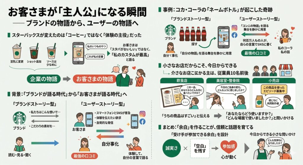 スターバックスのカスタマイズ文化とコカ・コーラのネームボトルキャンペーンに共通しているのは、「受け手が参加できる余白」を意図的に設計したことです。