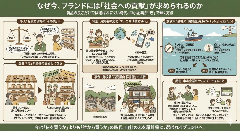商品の品質や価格で差がつきにくい時代だからこそ、「この会社は何のために存在しているのか」という志が、選ばれる理由になります。