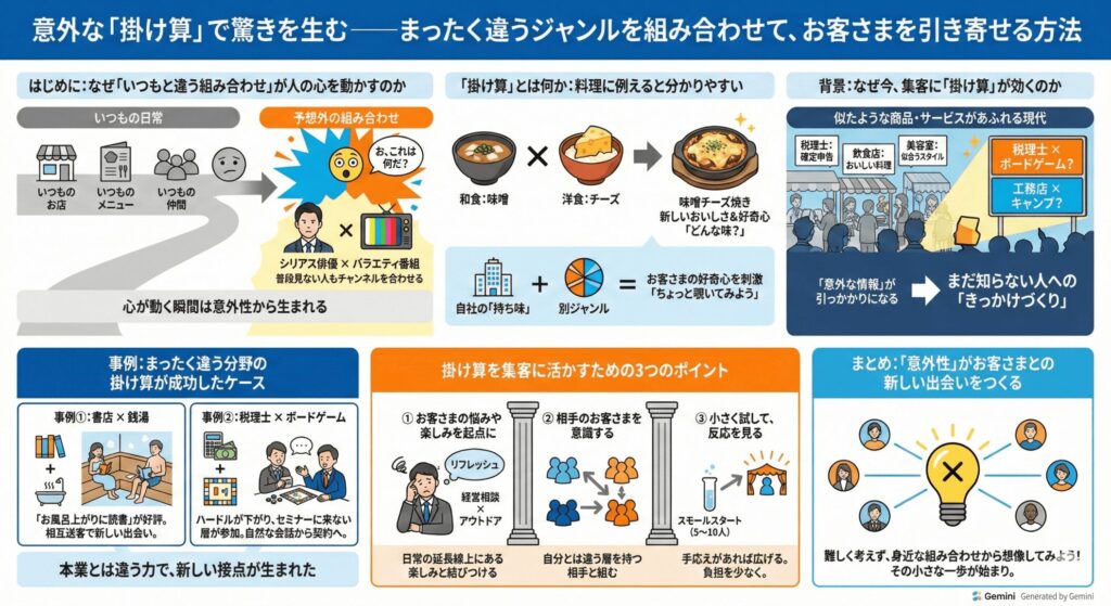 自分の事業の専門分野と、まったく別のジャンルを掛け合わせることで、これまで届かなかった人たちに「ちょっと気になる」と思ってもらえるようになります。今回は、この「意外な掛け算」を集客に活かす考え方と、実際に取り入れるためのヒントをお伝えします。